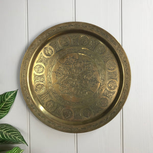 A beautiful vintage brass plate/wall plaque featuring an engraved pattern.