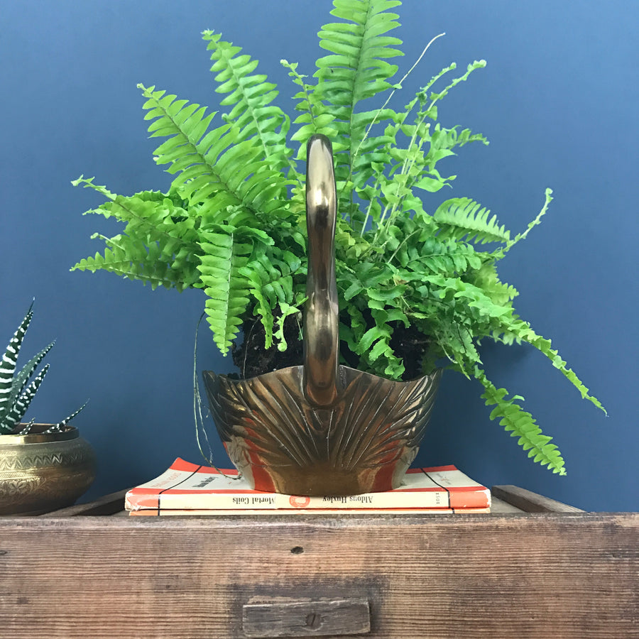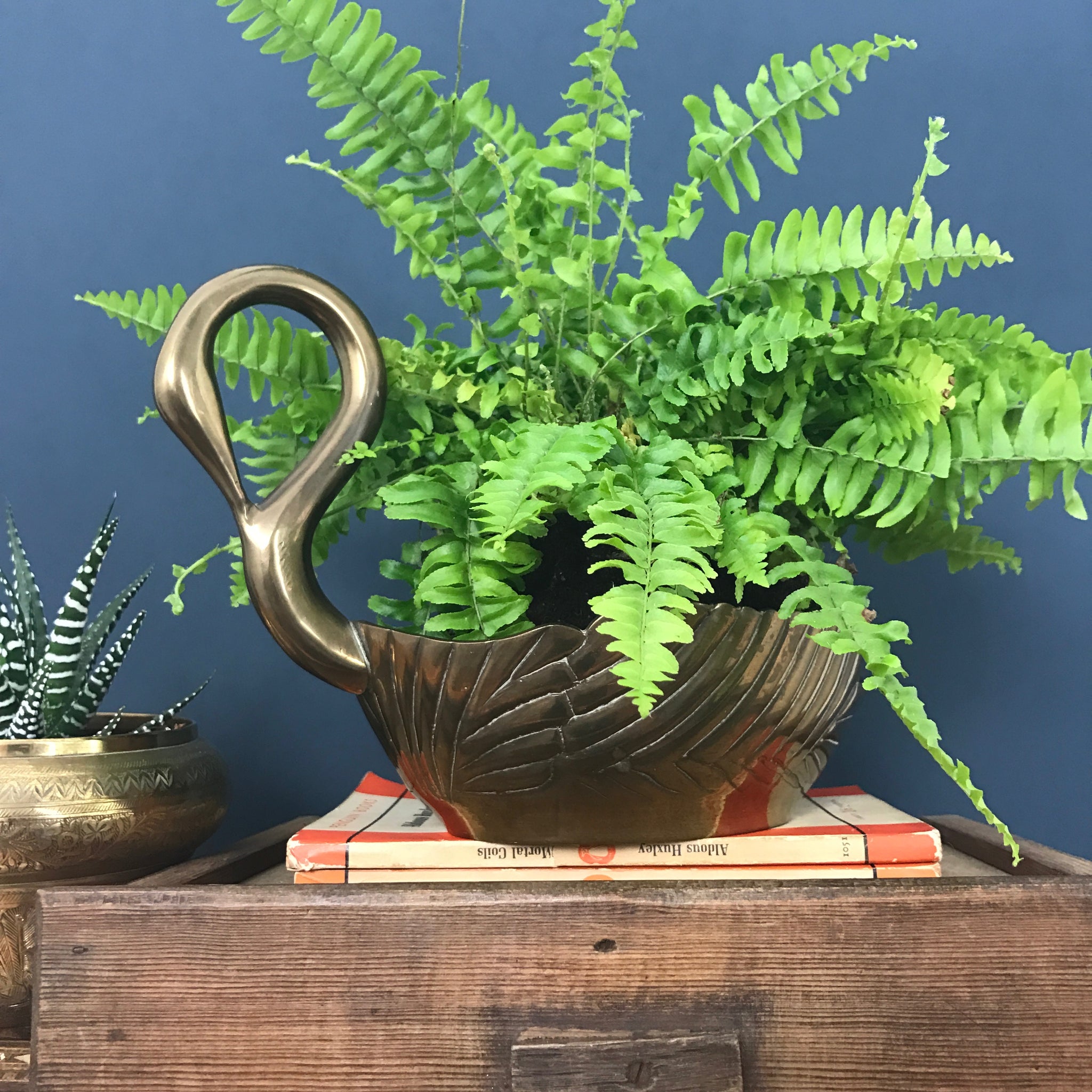A vintage brass swan planter with a stunning sleek shape and pattern detailing - the perfect way to display your greenery in style!