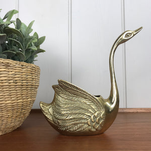 A vintage brass swan planter with a stunning sleek shape and pattern detailing - you can either leave it as an ornament or use it as a way to display your greenery in style!