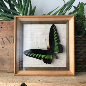 A vintage taxidermy of the male Rajah Brooke's Birdwing butterfly - the National butterfly of Malaysia (Trogonoptera brookiana - now a protected species). Set within its original frame and glass.