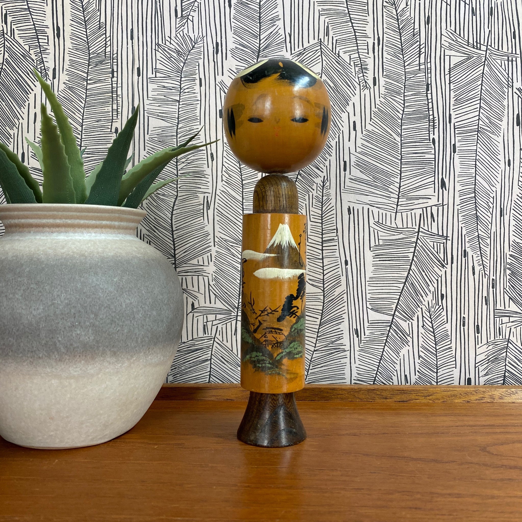 A stunning vintage Kokeshi Doll from Japan who we've named Chiasa (meaning one thousand mornings). Hand turned and painted featuring a beautiful landscape of the valley and mountains.