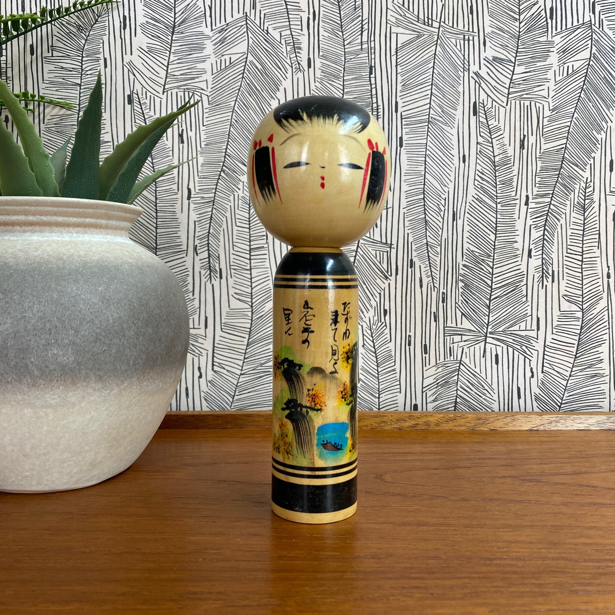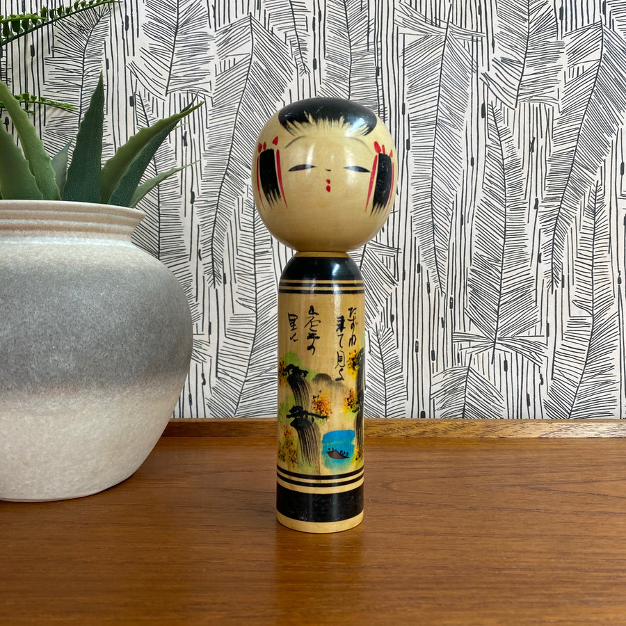 A stunning vintage Kokeshi Doll from Japan who we've named Asa (meaning born in the morning). Hand turned and painted featuring a beautiful landscape of the valley and mountains.