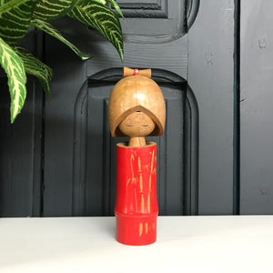 A stunning vintage Kokeshi Doll from Japan who we've named Mariko (meaning genuine). Hand turned and painted with a beautiful red bamboo pattern detailing - and with beautiful hair in a bow!