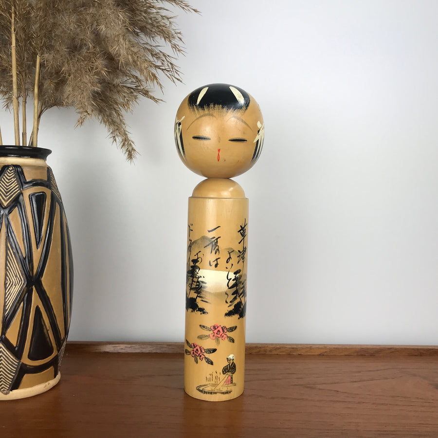 A stunning large vintage Kokeshi Doll from Japan who we've named Satoko (meaning wise baby). Hand turned and painted featuring a beautiful landscape design with pink detail which is quite rare.