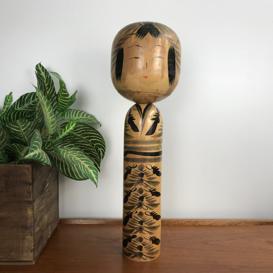 A stunning extra large vintage Kokeshi Doll from Japan who we've named Nakano (meaning famous female warrior). Hand turned and painted with a beautiful monochrome pattern.