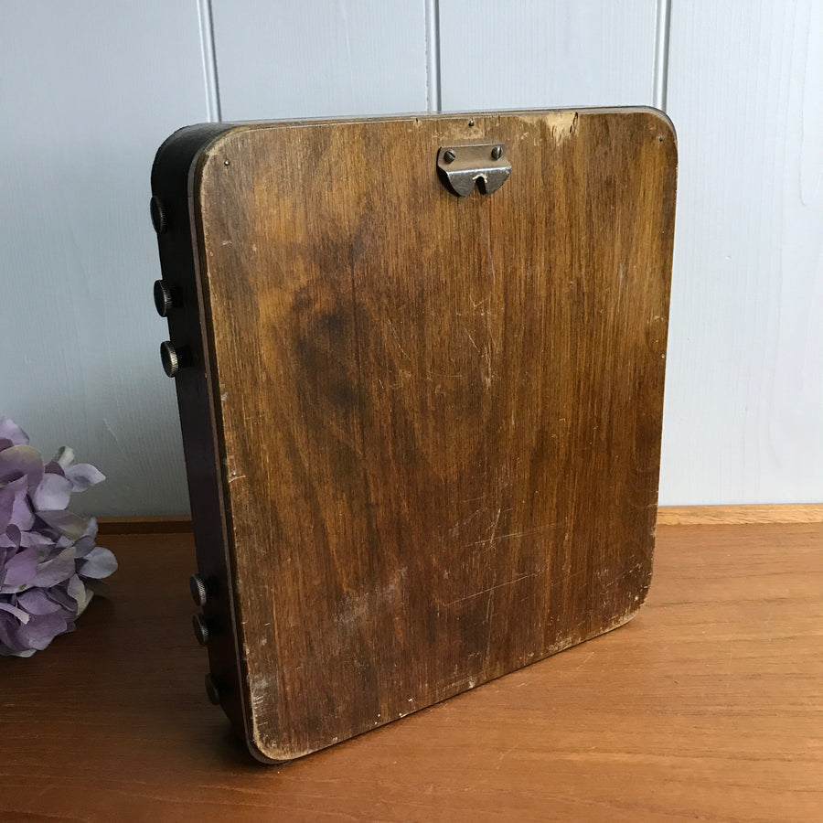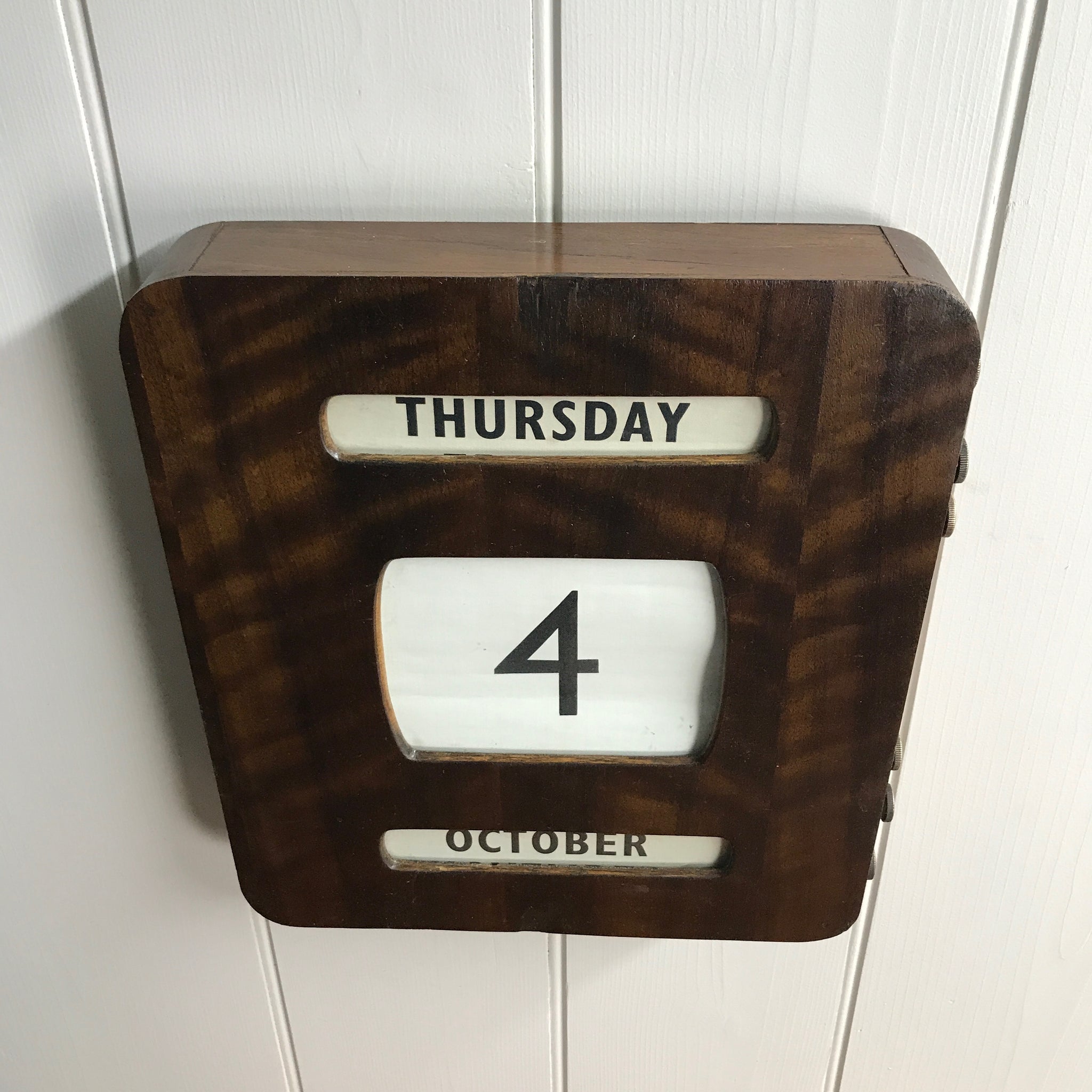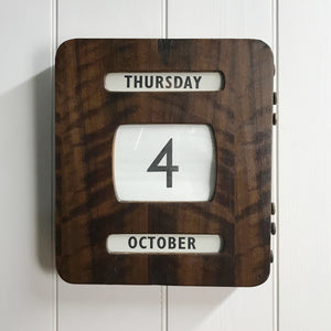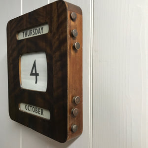 A scarcely seen, wooden perpetual wall or mantel calendar. This is piece is quite unusual as it is larger than the standard size that we have found in the past.