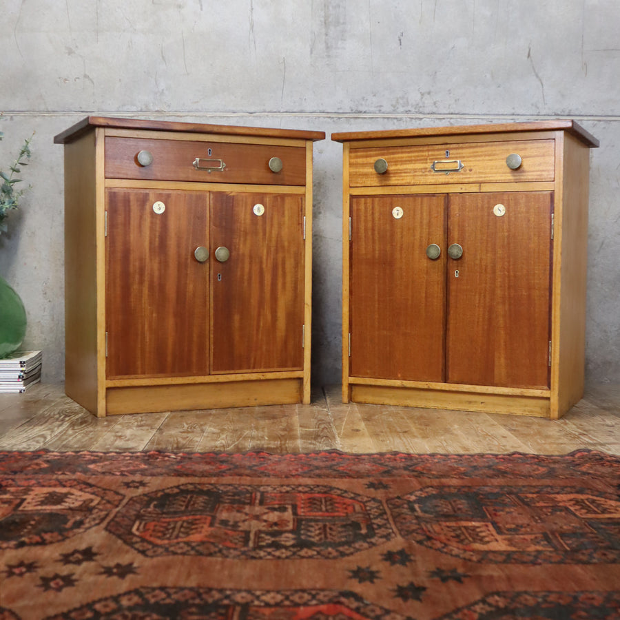 A striking reclaimed school laboratory cabinet with beech carcass and contrasting Iroko/Sapele top and drawer / doors. We rescued this beautiful piece from the science department in a School in Birmingham where it had been since the school was first built in the 1950s.