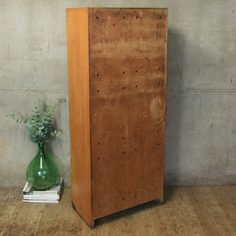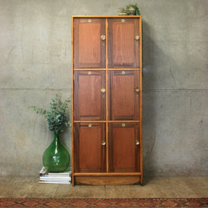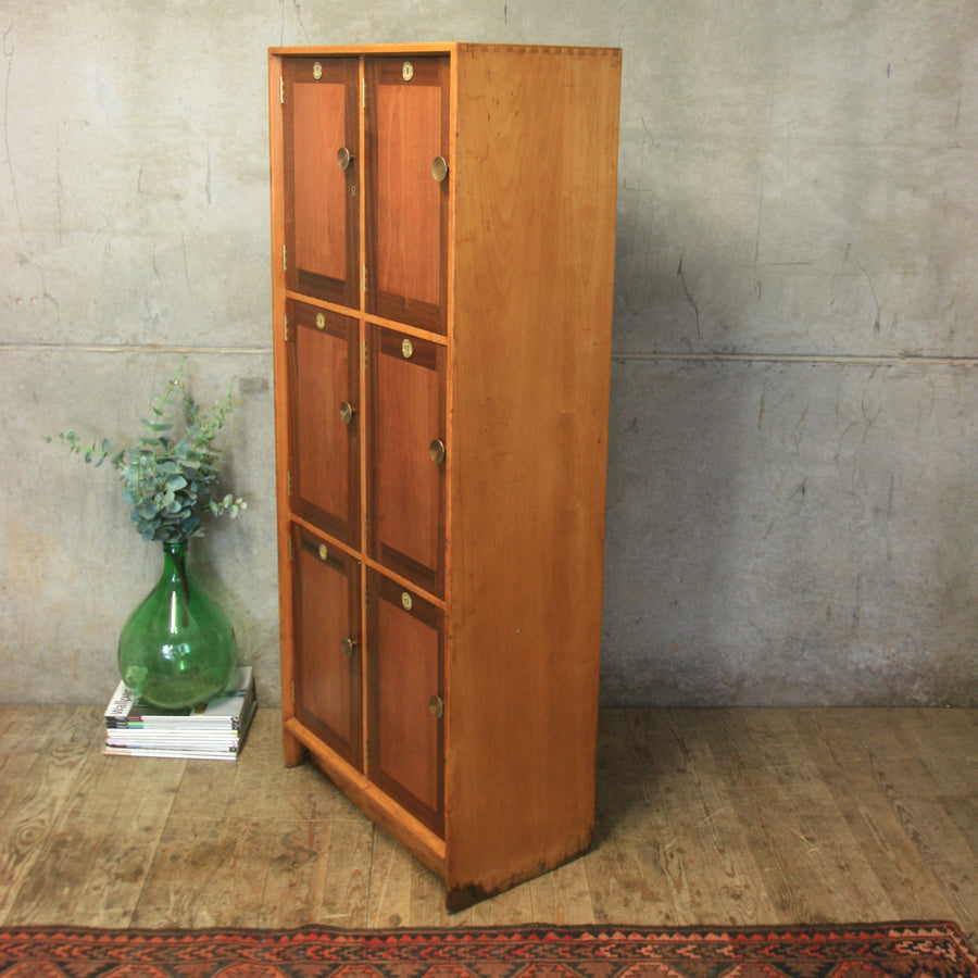 A striking set of six door lockers with beech carcass and contrasting Iroko/Sapele doors. We rescued this beautiful piece from a School in Birmingham where it had been since the school was first built in the 1950s.
