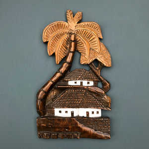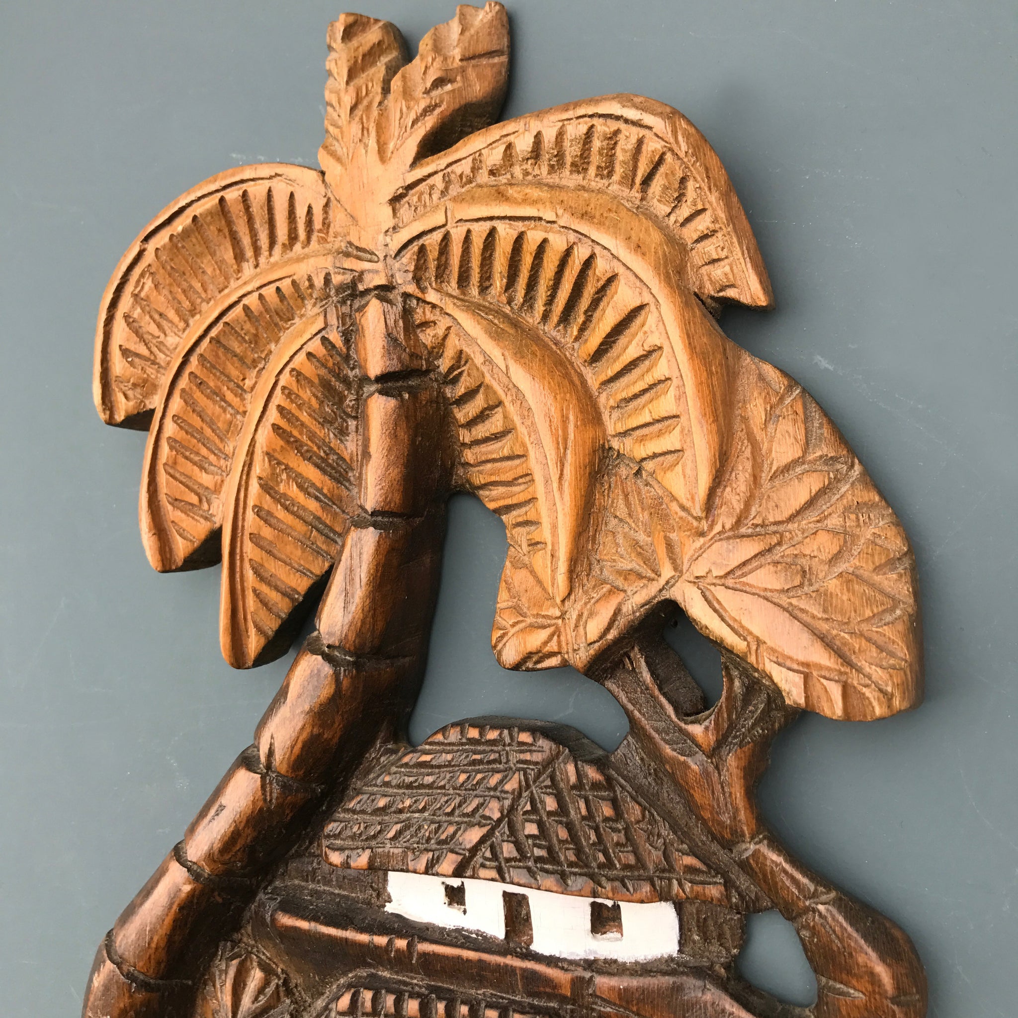 A beautiful vintage wall plaque with Tiki houses and palm trees carved into wood.