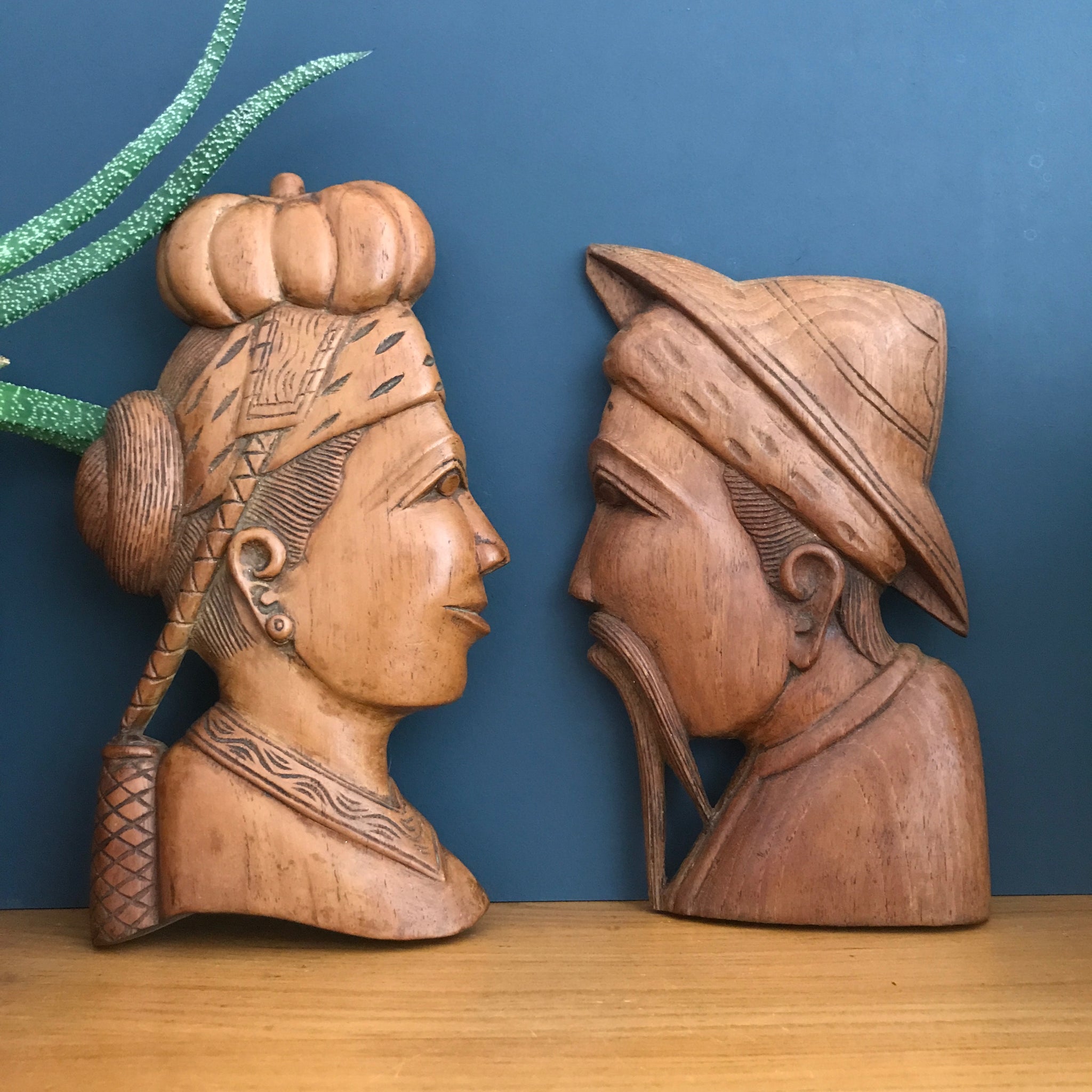 A striking pair of Tibetan wood carved heads with beautiful detailing. A unique pair who would look fantastic wall mounted or placed on a shelf/on top of furniture.